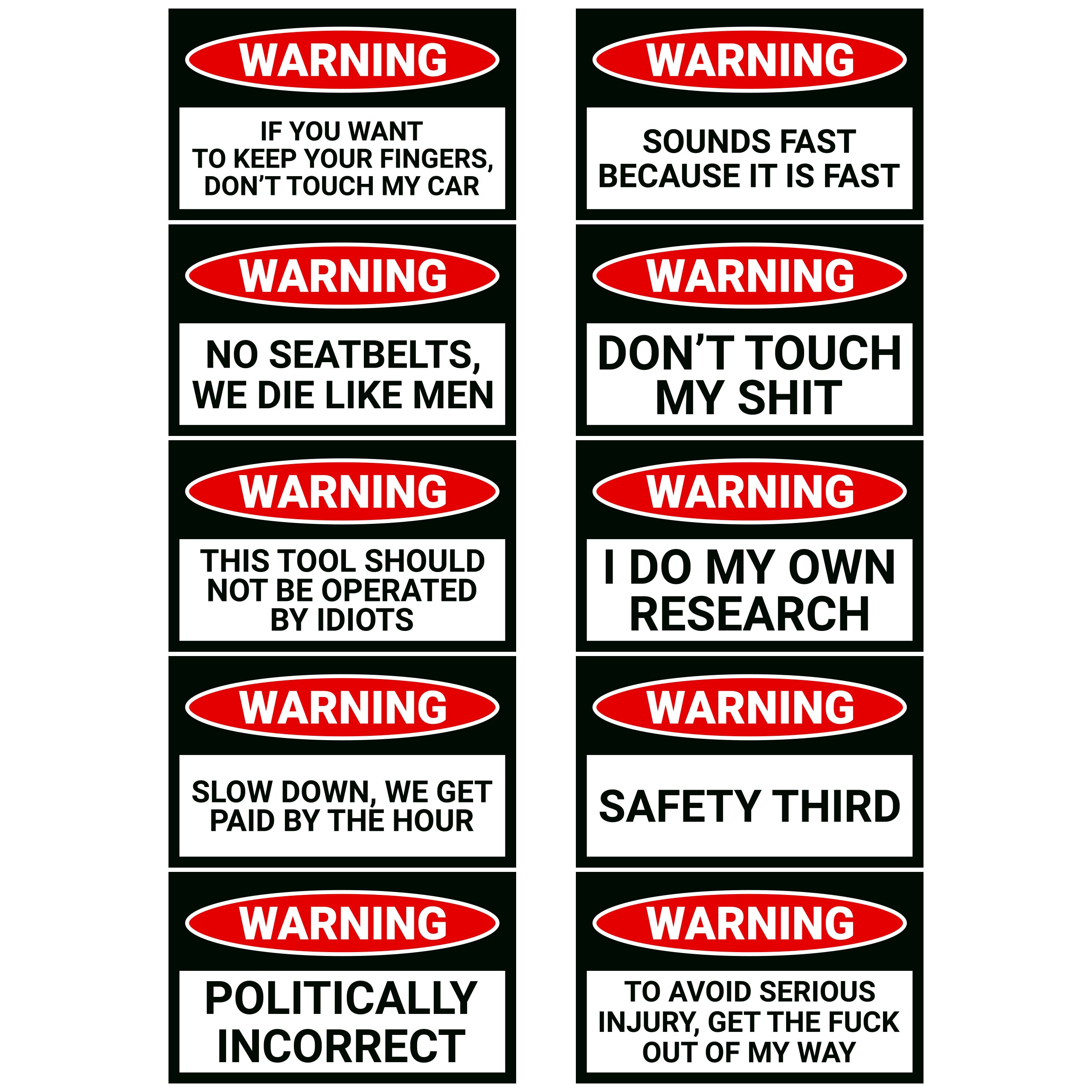 Have a great time pranking your colleagues and buddies with our hilarious warning stickers perfect for construction vehicles, machinery, garages, bikes, walls and any other non-porous surface! You'll receive 10 stickers with a variety of different warnings.