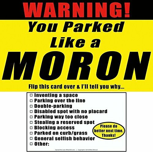- SICK OF RUDE IDIOTS PARKING LIKE JERKS? Finally you can unleash your righteous anger with Witty Yeti’s funny parking notes.
