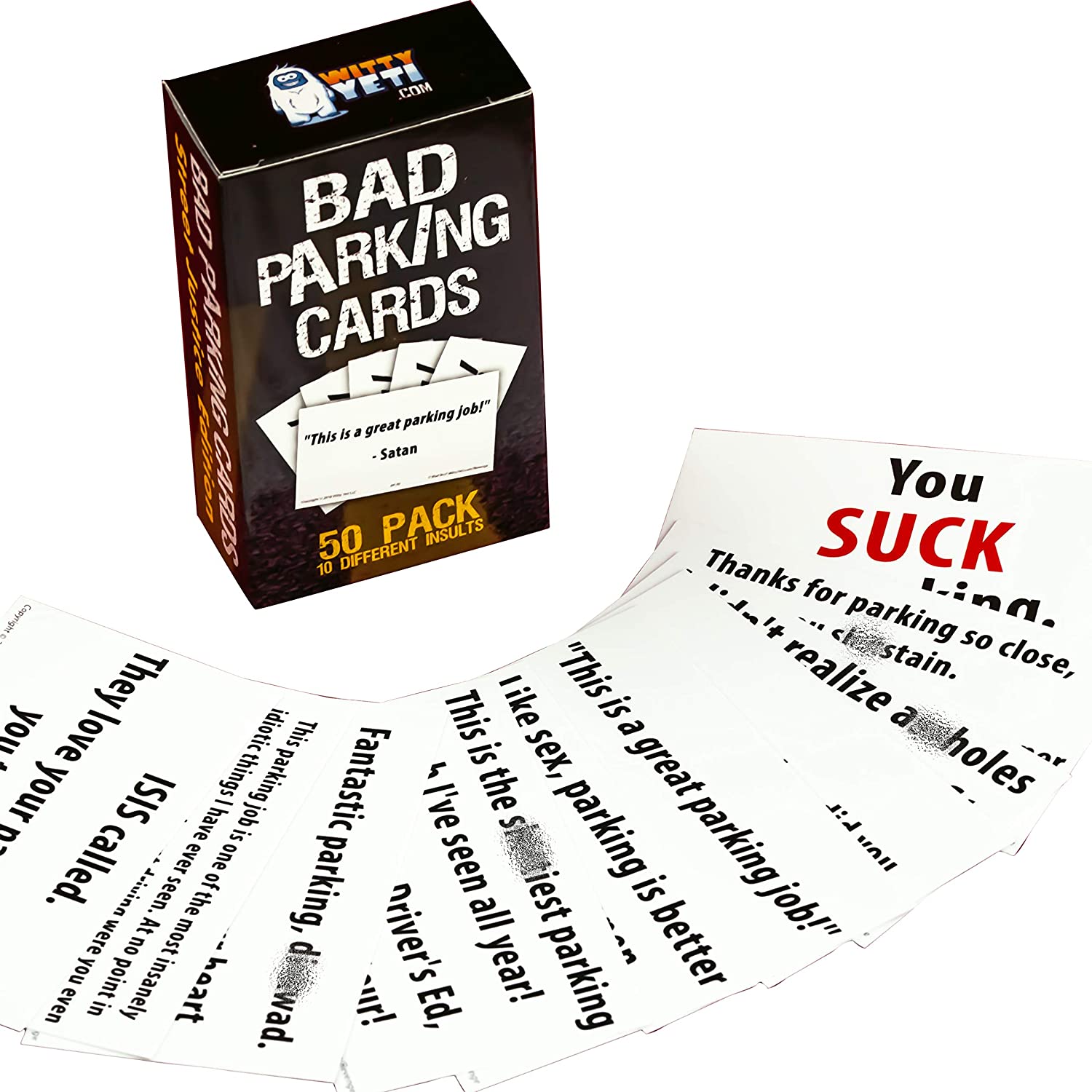 - GET QUIET, SWIFT REVENGE ON ASSHOLE DRIVERS. Don't have time to wait around for every bad parker to come back to their car? Leave a card so even if you're long gone, your angry sentiment lingers.